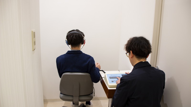 聴力測定用の検査機を使用して高い音、低い音の聞き取りテストを行ないます。